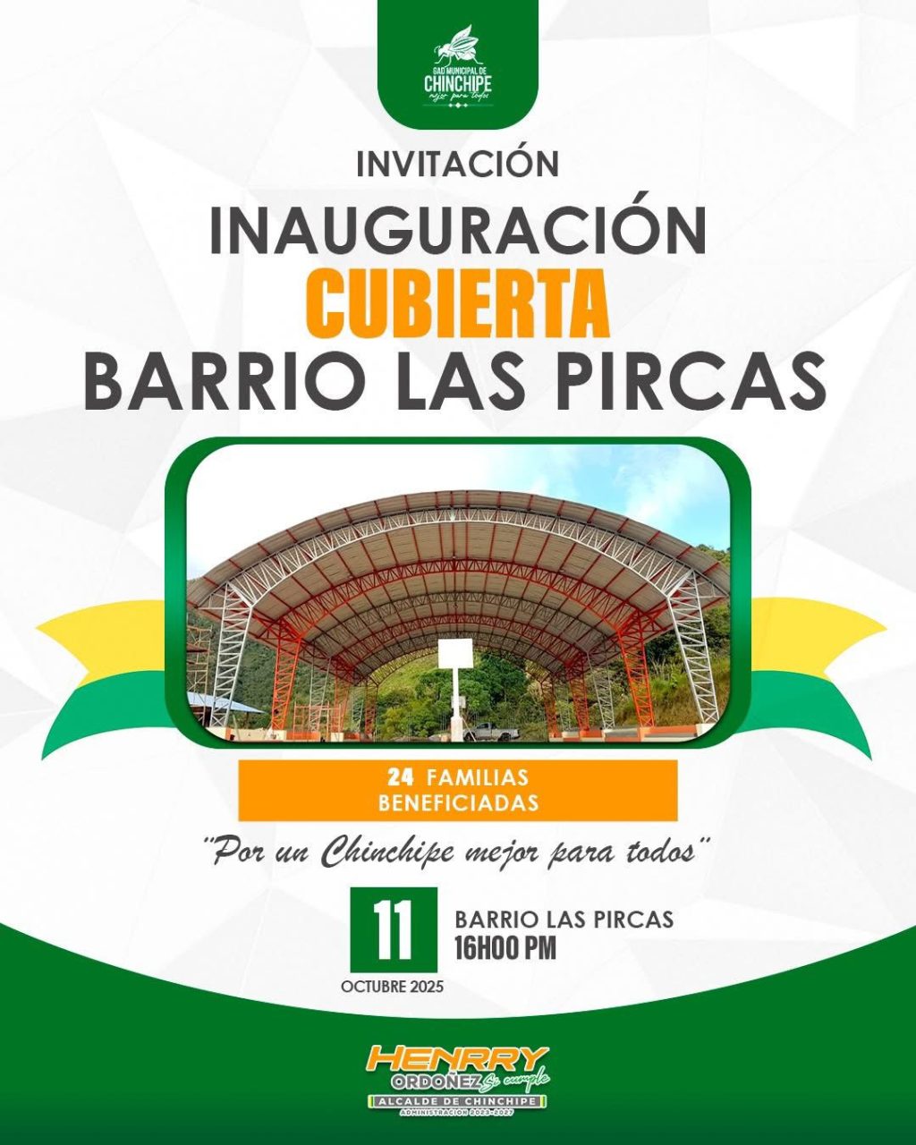 INVITACIÓN 🎊 INAUGURACIÓN DE LA CUBIERTA – BARRIO LAS PIRCAS 🎊 Acompañenos en este acto de entrega junto al Sr. Alcalde Henry Ordóñez y toda la comunidad. ¡Juntos seguimos trabajando por el desarrollo de nuestro cantón! 📅 Fecha: Sábado 11 de Octubre 2025 ⏰ Hora: 4:00 PM 📍 Lugar: Barrio Las Pircas ✅ 24 familias…