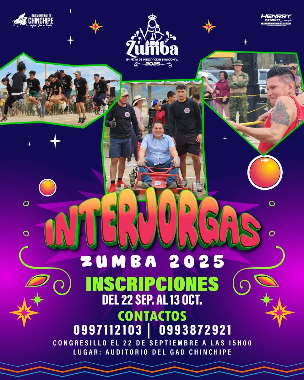 Ya están abiertas las inscripciones para el Interjorgas Zumba 2025, en el marco de la 54 Feria de Integración Binacional “Virgen del Rosario”. 𝐈𝐧𝐬𝐜𝐫𝐢𝐩𝐜𝐢𝐨𝐧𝐞𝐬: del 22 de septiembre al 13 de octubre de 2025 𝐂𝐨𝐧𝐠𝐫𝐞𝐬𝐢𝐥𝐥𝐨: 22 de septiembre – 15h00, Salón Auditorio del GAD Chinchipe 𝐂𝐨𝐧𝐭𝐚𝐜𝐭𝐨𝐬: 0997112103 / 0993872931 ¡No te quedes fuera de esta…